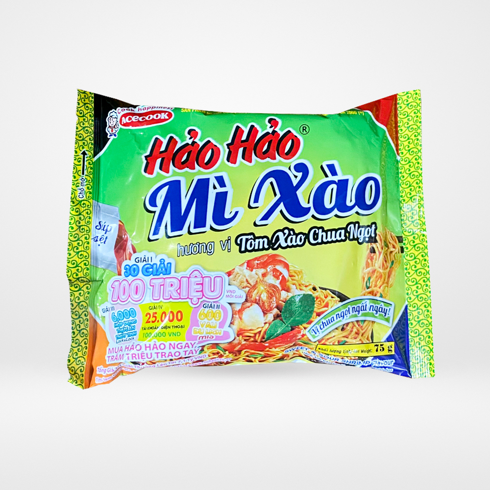 Mì xào Hảo Hảo chua ngọt được chế biến từ bột mì nguyên chất kết hợp với tôm và các loại rau củ quả tươi ngon, tẩm ướp gia vị hợp lý phù hợp với khẩu vị của người Việt. Sợi mì có màu vàng óng tự nhiện, không có phẩm màu, an toàn cho sức khỏe người tiêu dùng. Sản phẩm với sợi mì dai, mềm hòa quyện trong nước sốt đậm đà, thơm ngon của hương vị tôm xào chua ngọt đặc trưng HSD: 5 tháng kể từ ngày sản xuất
