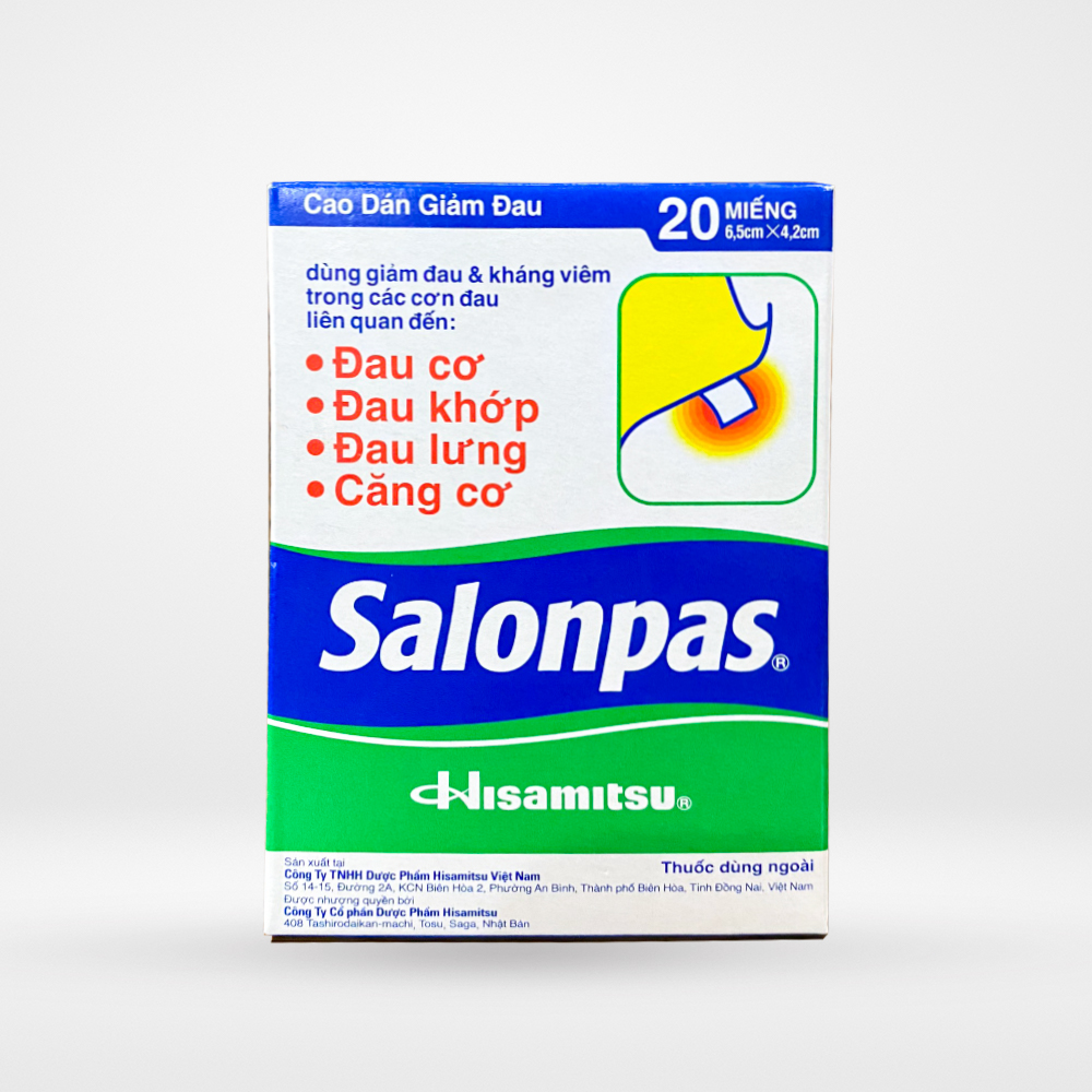 Cao dán Salonpas dán giảm đau là sản phẩm thuộc nhóm thuốc giảm đau, kháng viêm dùng ngoài da do công ty Hisamitsu sản xuất. Kể từ khi có mặt tại Việt Nam vào năm 1994, thương hiệu Salonpas đã trở thành một trong những giải pháp giảm đau không kê đơn vô cùng hiệu quả, có mặt tại hầu hết các tủ thuốc gia đình.